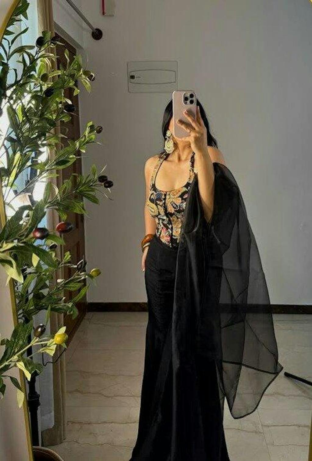 The Kesha Sharara Set is a chic Indo-Western ensemble that redefines festive elegance with its sleek and contemporary design. Crafted in luxurious black crepe fabric, the set features a finely tailored top paired with coordinated sharara bottoms for a refined yet modern silhouette. A matching dupatta in lightweight fabric with subtle detailing completes the look, making it a versatile choice for weddings, cocktail evenings, or festive occasions.