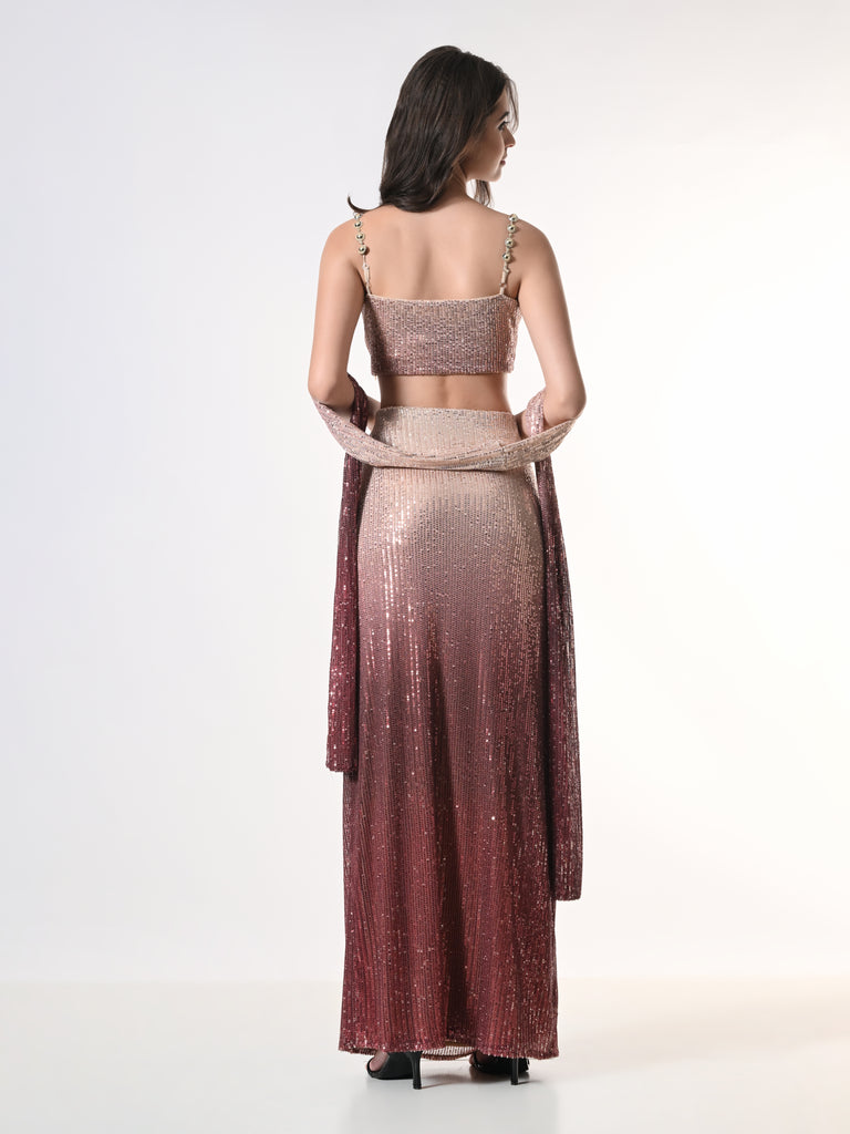 Step into the spotlight with the LYANA Co-Ord Set, a bold and glamorous skirt set designed to make an impact. Crafted from luxe sequins and lycra fabric, this statement ensemble features a stunning brown ombre finish that catches the light beautifully with every movement. The fitted silhouette enhances the body while offering stretch and comfort, making it ideal for long party nights. Perfect for cocktail evenings, celebrations, and festive occasions, the Lyana Co-Ord Set delivers confident, high-fashion appeal.