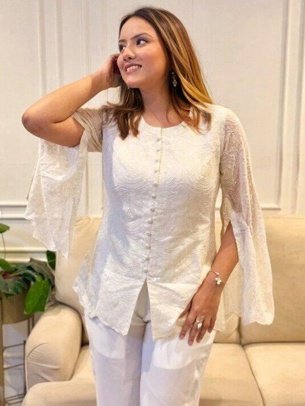 The NARGIS Intricate Embroidery Georgette Indo-Western Co-ord Set in elegant off-white is a beautiful fusion of traditional and modern design. Crafted from soft georgette, this set features intricate embroidery that enhances its sophistication, making it ideal for festive occasions and special gatherings. With its graceful silhouette and refined detailing, the NARGIS set embodies elegance and charm.
