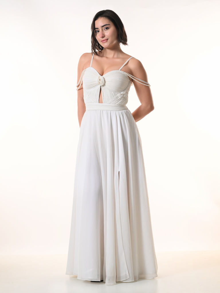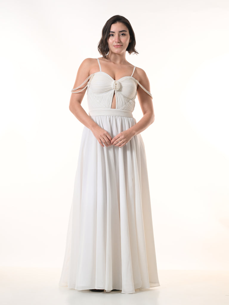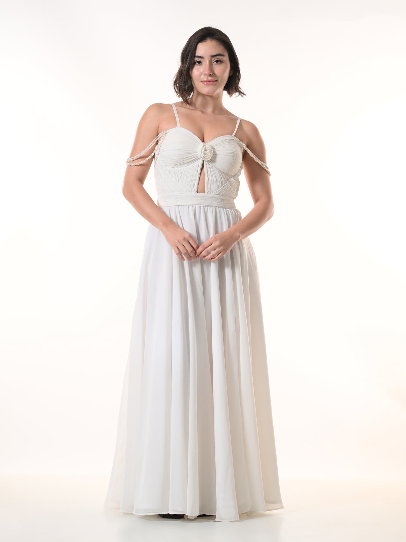 Grace meets glamour in the PEARL dress. Crafted from soft, flowy poly georgette, this pearl white maxi dress features a beautifully draped bodice with a delicate rosette detail at the center, creating an elegant focal point. The soft shoulder pearl chains add a subtle statement touch, while the fitted waist flows into a graceful, floor-length silhouette. Perfect for evening occasions, parties, and special celebrations where effortless elegance is key.