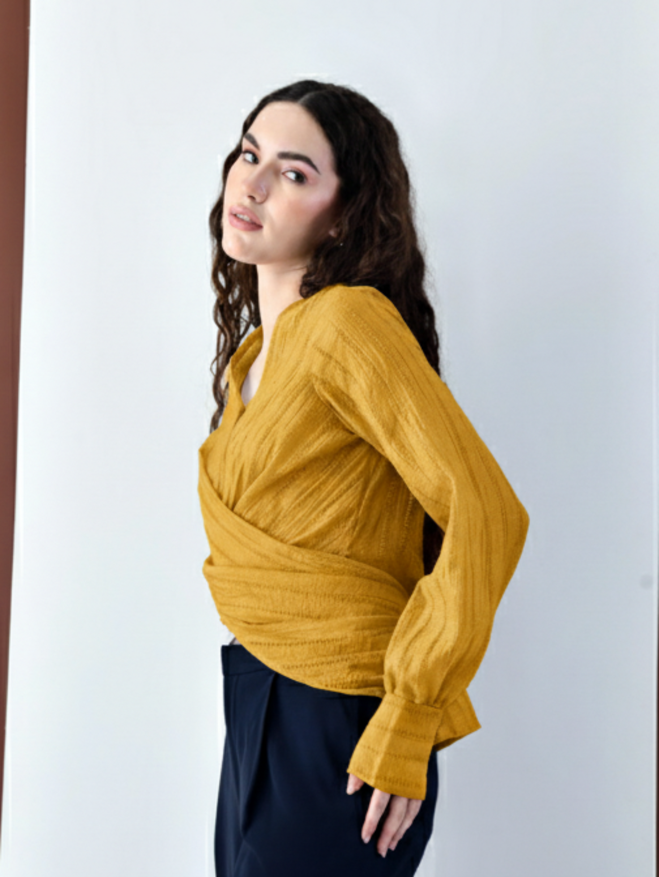Elevate your style with the Pixie Shirt – a sophisticated wrap-style blouse designed for effortless elegance. Crafted from a soft textured fabric, this top features tonal threadwork that adds depth while keeping the design minimal and chic. The unique wrap-front silhouette cinches at the waist, creating a flattering, sculpted shape. Balloon sleeves with defined cuffs lend a romantic flair, making it perfect for desk-to-dinner transitions or weekend evenings out.