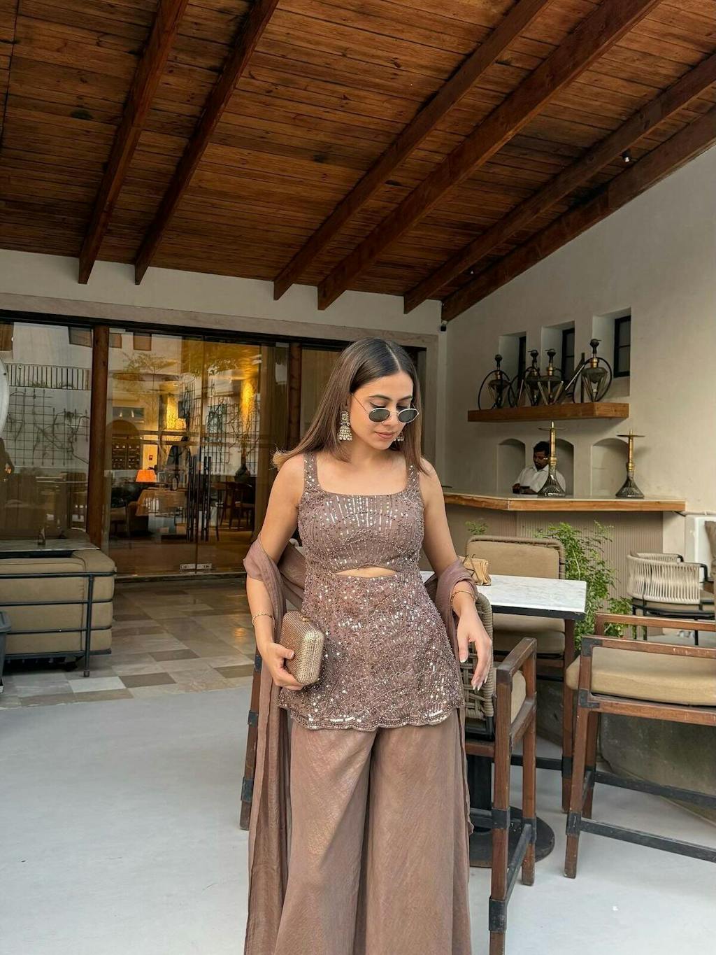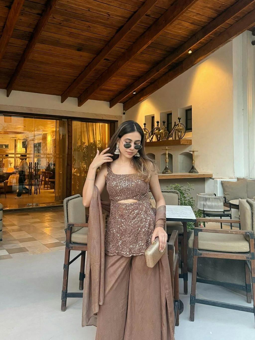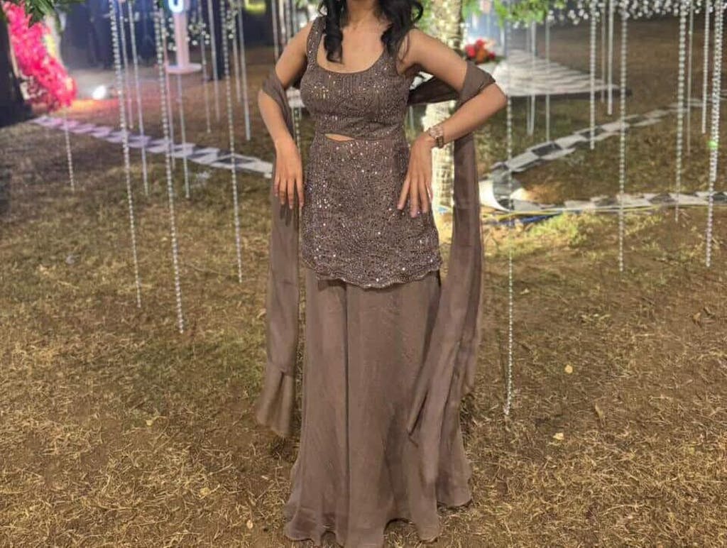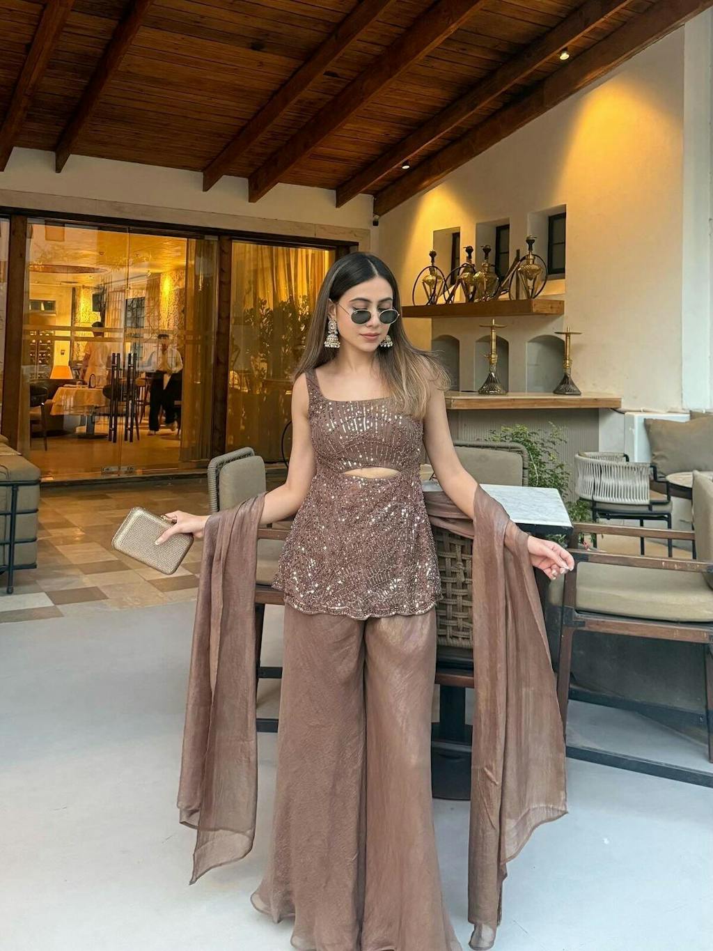 The Sophia Indo-Western Sharara Set is a beautiful fusion of ethnic elegance and contemporary design. Crafted from embroidered net and georgette fabric, this set features a stylishly detailed top paired with flowy sharara bottoms. The rich brown hue adds depth and sophistication, making it ideal for festive gatherings or special occasions. The intricate embroidery lends a luxurious touch, while the modern silhouette ensures a flattering and graceful look.