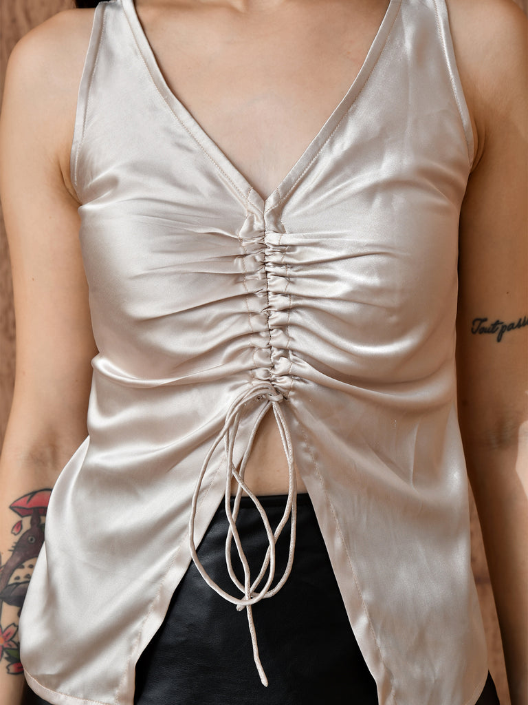 Vivienne satin handwash top in beige combines elegance and luxury with its satin fabric and contemporary design. This top offers a chic and sophisticated look that’s perfect for both casual and formal occasions, making it a versatile addition to any wardrobe.