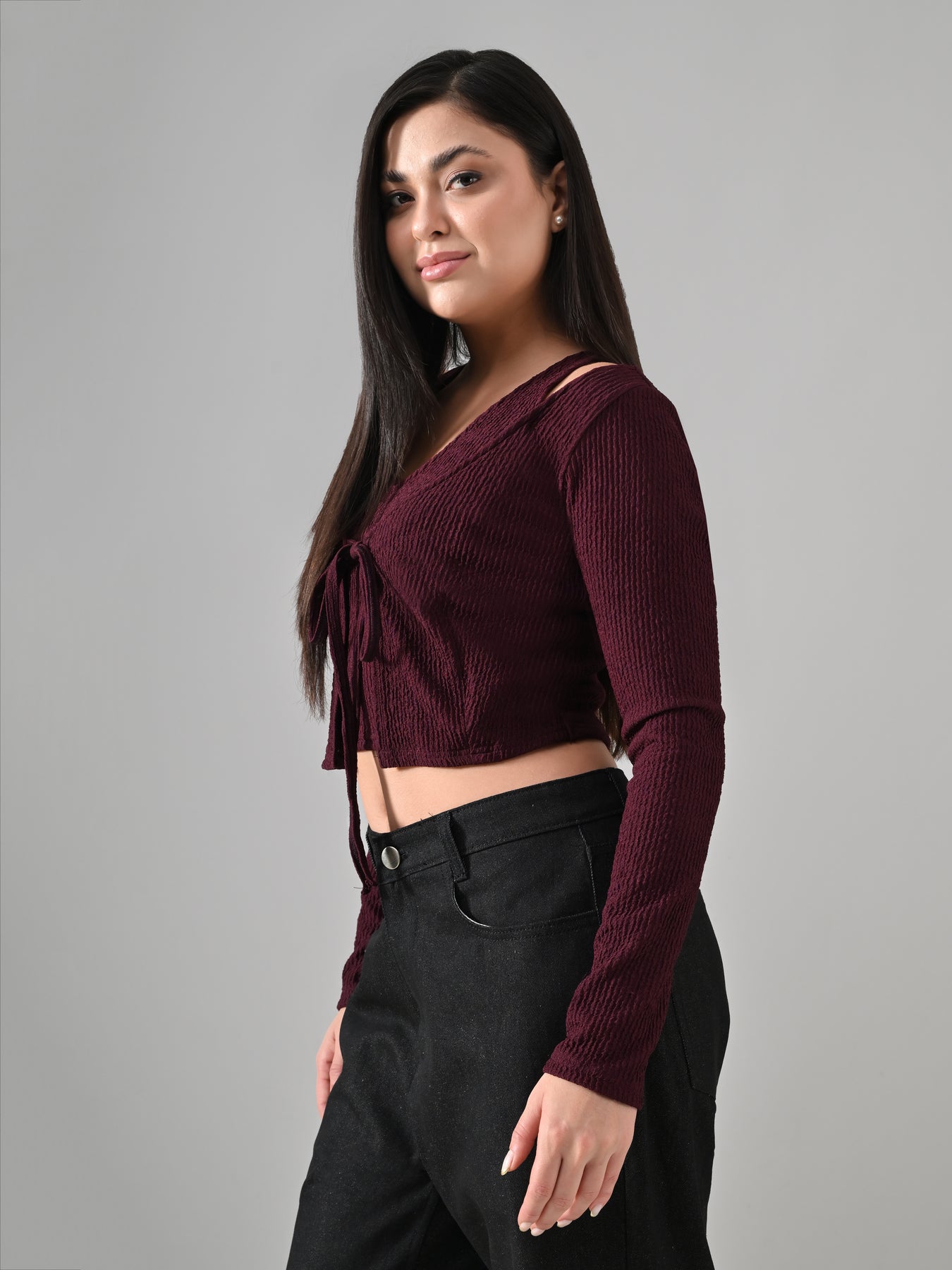 The Wine Top is a stylish and contemporary piece crafted from soft bubble-knit fabric. Designed with a unique layered neckline and long sleeves, it offers a chic blend of comfort and modern elegance. The cropped length and tie-front detail enhance its youthful appeal, making it perfect for casual outings, brunch dates, or elevated everyday wear. Versatile and flattering, this top adds a bold yet refined touch to your wardrobe.